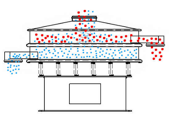 不銹鋼振動篩由直立式振動電機作為激振源,電機上、下兩端安裝有偏心重錘,將電機的旋轉(zhuǎn)運動轉(zhuǎn)變?yōu)樗健⒋怪薄A斜的三次元運動,再把這個運動傳遞給篩面,使篩面上的物料一起運動,小于篩面孔徑的物料通過篩孔落到下層,大于篩面孔徑的物料從排料口排出,終完成篩分工作。在實際運行過程中,還可以通過調(diào)節(jié)上、下兩端的相位角,改變物料在篩面上的運動軌跡,從而達到不同篩分目的。