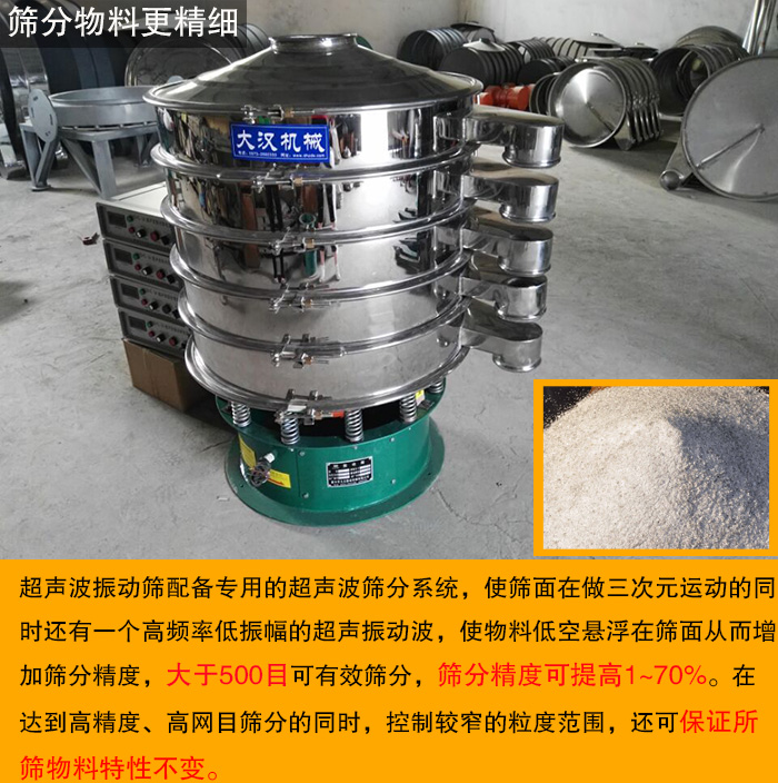 對(duì)于一些細(xì)粉、微粉類物料普通的振動(dòng)篩很難完成的篩分,特別是500目以上的物料,普通的振動(dòng)篩分機(jī)更難達(dá)到, 因?yàn)樵诤Y分中它們?nèi)菀壮霈F(xiàn)結(jié)塊和漏料的情況。超聲波振動(dòng)篩能很好的避免。超聲波振動(dòng)篩配備專用的超聲波篩分系統(tǒng),使篩面在做三次元運(yùn)動(dòng)的同時(shí)還有一個(gè)高頻率低振幅的超聲振動(dòng)波,使物料低空懸浮在篩面從而增加篩分精度,篩分精度可提高1~70%。在達(dá)到高精度、高網(wǎng)目篩分的同時(shí),控制較窄的粒度范圍,還可保證所篩物料特性不變。比普通的旋振篩多了一套超聲波發(fā)生裝置,該裝置安裝在網(wǎng)架的下端,可以通過(guò)該裝置對(duì)較為精細(xì)的物料進(jìn)行篩分,物料不僅受到振動(dòng)電機(jī)的振動(dòng),而且還受到超聲波換能器的機(jī)械振動(dòng),因此篩分物料較為精細(xì)。