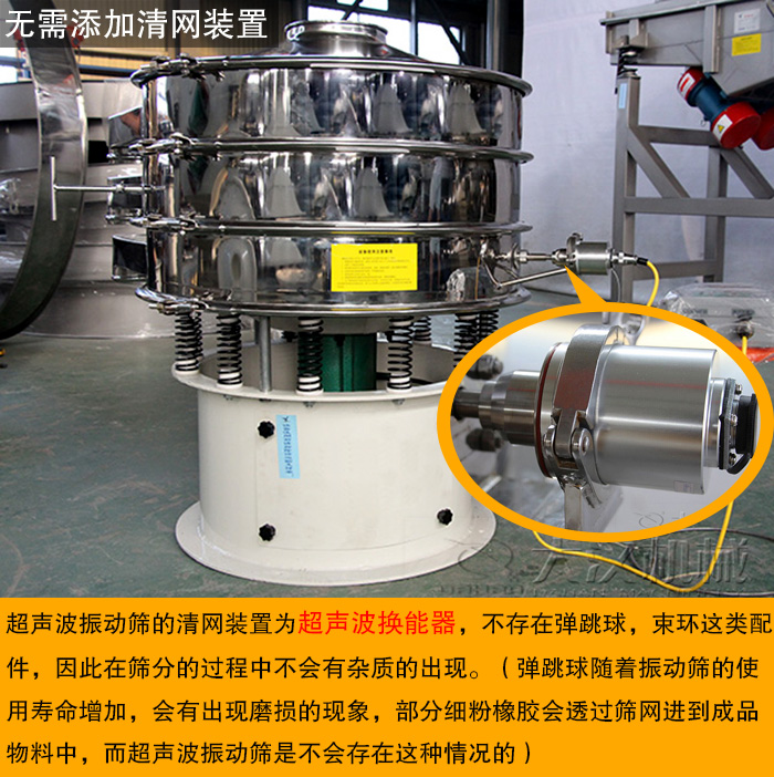 超聲波振動(dòng)篩的清網(wǎng)裝置為超聲波換能器,不存在彈跳球,束環(huán)這類配件,因此在篩分的過(guò)程中不會(huì)有雜質(zhì)的出現(xiàn)。(彈跳球隨著振動(dòng)篩的使用壽命增加,會(huì)有出現(xiàn)磨損的現(xiàn)象,部分細(xì)粉橡膠會(huì)透過(guò)篩網(wǎng)進(jìn)到成品物料中,而超聲波振動(dòng)篩是不會(huì)存在這種情況的)