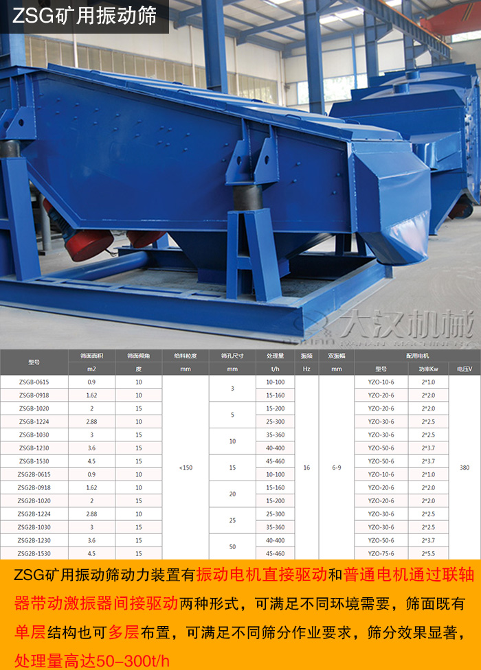 新鄉(xiāng)大漢ZSG礦用振動篩動力裝置有振動電機直接驅(qū)動和普通電機通過聯(lián)軸器帶動激振器間接驅(qū)動兩種形式,可滿足不同環(huán)境需要,篩面既有單層結(jié)構(gòu)也可多層布置,可滿足不同篩分作業(yè)要求,篩分效果顯著,處理量高達50-300t/h。