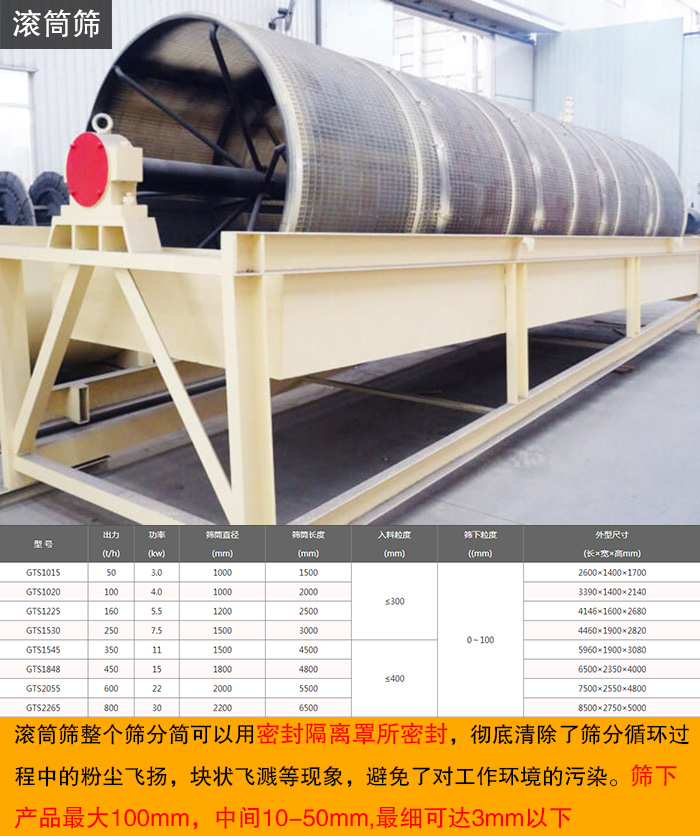 整機運行安全可靠,采用低速傳動,傳動效率高,配帶功率小,能耗低。整個篩分簡可以用密封隔離罩所密封,清除了篩分循環(huán)過程中的粉塵飛揚,塊狀飛濺等現(xiàn)象,避免了對工作環(huán)境的污染。篩下產(chǎn)品大100mm,中間10-50mm,細可達3mm以下。