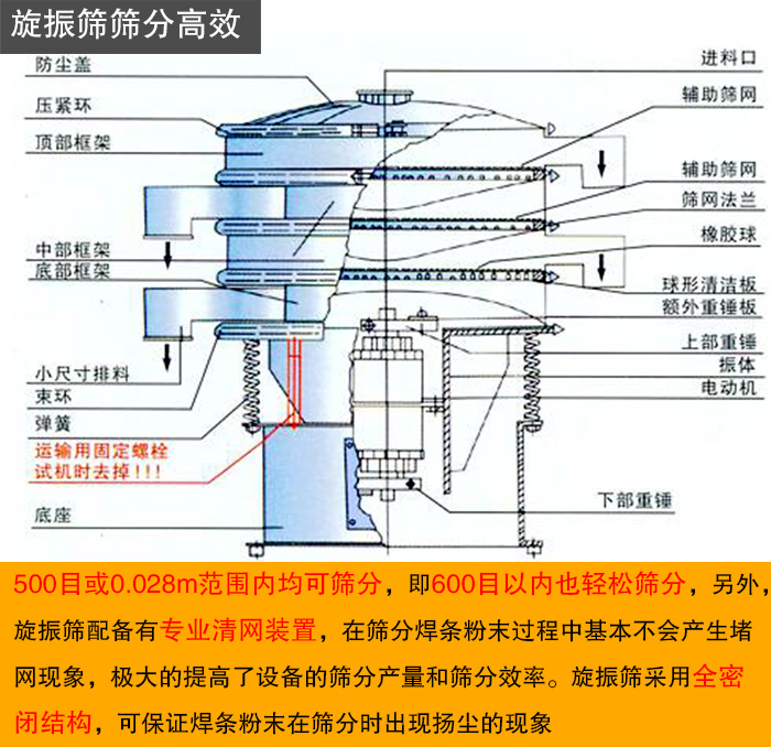 旋振篩作為高精細(xì)細(xì)粉篩分設(shè)備,其篩分物料范圍廣,無論物料的干與濕,精細(xì)與粗糙,重與輕,只要在500目或0.028m范圍內(nèi)均可篩分,即使物料是液體的或漿狀的只要在600目以內(nèi)也輕松篩分,另外,旋振篩配備有專業(yè)清網(wǎng)裝置,在篩分物料的過程中基本不會(huì)產(chǎn)生堵網(wǎng)現(xiàn)象,極大的提高了設(shè)備的篩分產(chǎn)量和篩分效率。旋振篩采用全密閉結(jié)構(gòu),可保證焊條粉末在篩分時(shí)出現(xiàn)揚(yáng)塵的現(xiàn)象。