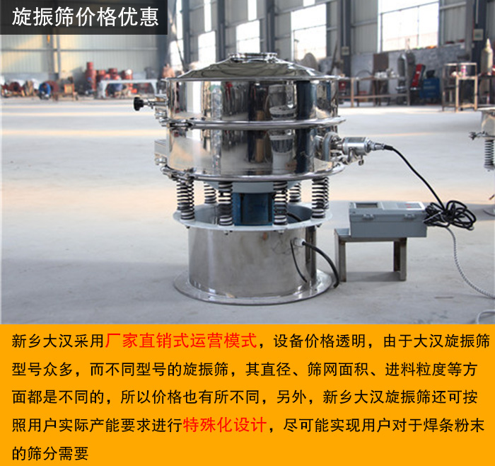 新鄉(xiāng)大漢采用廠家直銷式運(yùn)營(yíng)模式,設(shè)備價(jià)格透明,由于大漢旋振篩型號(hào)眾多,主要有DH-600、DH-800、DH-1000、DH-1200、DH-1500、DH-1800、DH-2000,而不同型號(hào)的旋振篩,其直徑、篩網(wǎng)面積、進(jìn)料粒度等方面都是不同的,所以價(jià)格也有所不同,另外,新鄉(xiāng)大漢旋振篩還可按照用戶實(shí)際產(chǎn)能要求進(jìn)行特殊化設(shè)計(jì),盡可能實(shí)現(xiàn)用戶對(duì)于焊條粉末的篩分需要,所以,具體旋振篩價(jià)格這里無法給出詳細(xì)的數(shù)字,具體價(jià)格根據(jù)用戶選型情況計(jì)算。