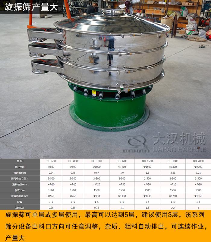 旋振篩可單層或多層使用,高可以達(dá)到5層,建議使用3層,該系列篩分設(shè)備出料口方向可任意調(diào)整,雜質(zhì)、粗料自動(dòng)排出,可連續(xù)作業(yè),產(chǎn)量大。