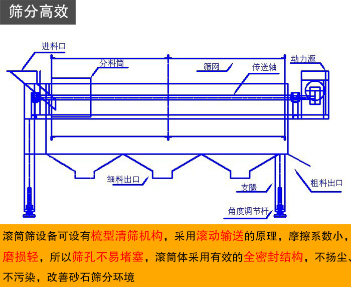 滾筒篩設(shè)備可設(shè)有梳型清篩機構(gòu),在篩分過程中,不管進入篩分筒的物料多臟、多雜都可以篩分,從而提高了該系列振動篩的篩分效率,非常適合篩分砂石。滾筒篩是由電動機通過減速器、聯(lián)軸器驅(qū)動傾斜安裝于機架上的滾筒繞其軸線轉(zhuǎn)動的,正是由于滾筒篩采用這種滾動輸送的原理,摩擦系數(shù)小,磨損輕,所以篩孔不易堵塞,滾筒體采用有效的全密封結(jié)構(gòu),不揚塵、不污染,改善砂石篩分環(huán)境。