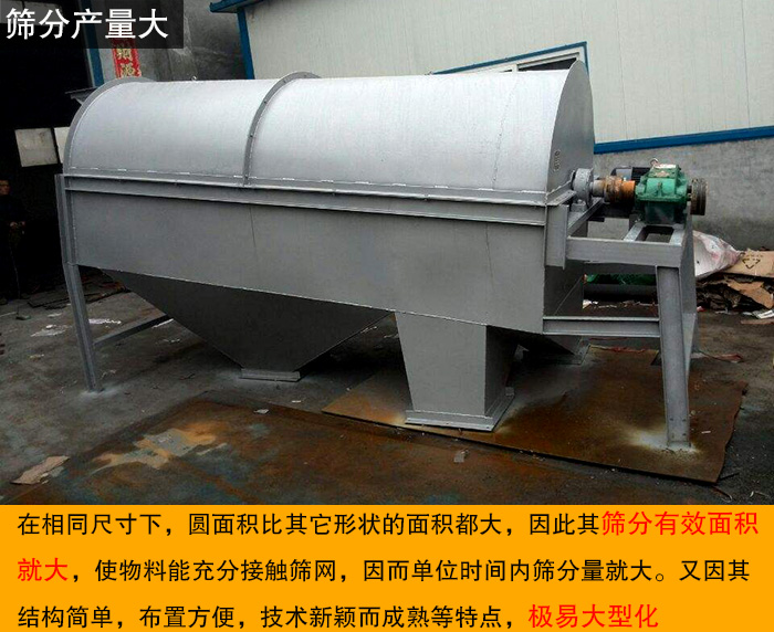 在相同尺寸下,圓面積比其它形狀的面積都大,因此其篩分有效面積就大,使物料能充分接觸篩網(wǎng),因而單位時間內(nèi)篩分量就大。又因其結(jié)構(gòu)簡單,布置方便,技術(shù)新穎而成熟等特點,極易大型化。