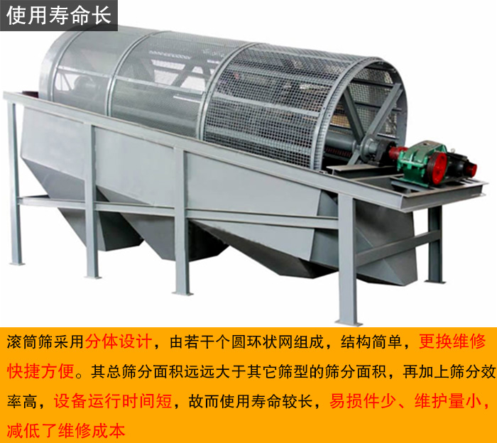 滾筒篩采用分體設(shè)計,由若干個圓環(huán)狀網(wǎng)組成,結(jié)構(gòu)簡單,更換維修快捷方便。其總篩分面積遠遠大于其它篩型的篩分面積,再加上篩分效率高,設(shè)備運行時間短,故而使用壽命較長,易損件少、維護量小,減低了維修成本。
