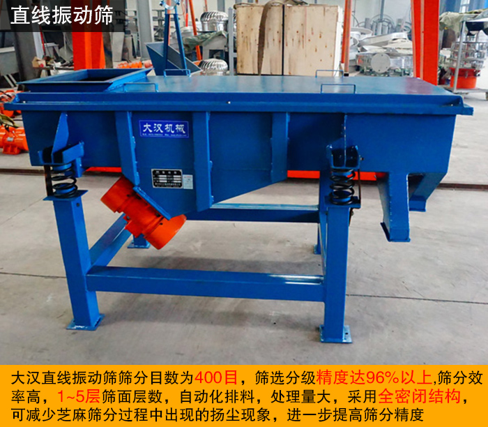 大漢直線振動(dòng)篩篩分目數(shù)為400目,篩選分級(jí)精度達(dá)96%以上,篩分效率高,1~5層篩面層數(shù),自動(dòng)化排料,處理量大,采用全密閉結(jié)構(gòu),可減少芝麻篩分過程中出現(xiàn)的揚(yáng)塵現(xiàn)象,進(jìn)一步提高篩分精度。