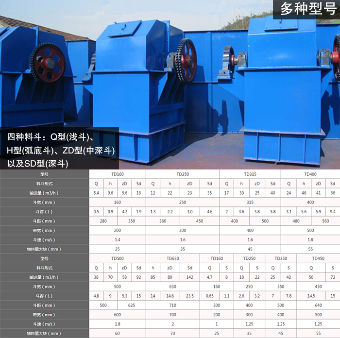 大漢td斗式提升機型號包括td160斗式提升機、td250斗式提升機、td315斗式提升機、td400斗式提升機,且TD型斗式提升機備有四種料斗:Q型(淺斗)、H型(弧底斗)、ZD型(中深斗)以及SD型(深斗)。不同型號、不同料斗的td斗式提升機輸送量是不同的,可以滿足用戶的更多要求。