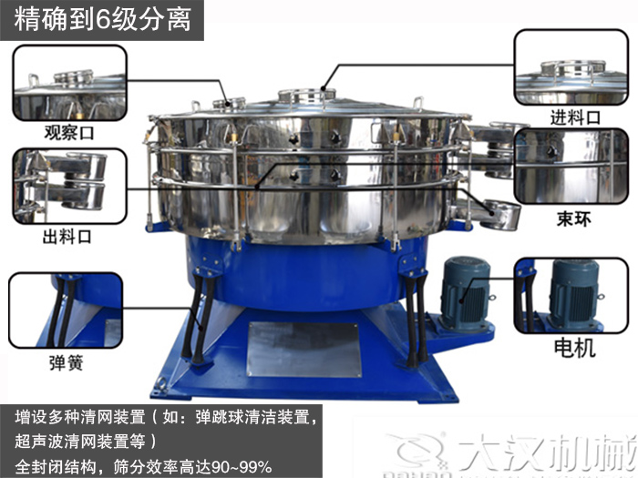 圓形搖擺篩可到6級(jí)分離,另外,還可增設(shè)多種清網(wǎng)裝置(如:彈跳球清潔裝置,超聲波清網(wǎng)裝置等),可有效解決篩面堵塞問(wèn)題,確保篩分的連續(xù)性,采用全封閉結(jié)構(gòu),減少對(duì)環(huán)境的污染,篩分效率高達(dá)90~99%。