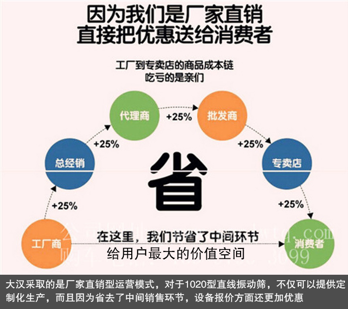 大漢采取的是廠家直銷(xiāo)型運(yùn)營(yíng)模式,對(duì)于1020型直線振動(dòng)篩,不僅可以提供定制化生產(chǎn),而且因?yàn)槭∪チ酥虚g銷(xiāo)售環(huán)節(jié),設(shè)備報(bào)價(jià)方面還更加優(yōu)惠,保證讓您以較低的價(jià)格購(gòu)得滿意的直線振動(dòng)篩設(shè)備。