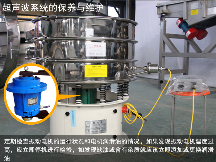 振動電機作為超聲波振動篩的主要動力來源,在實際生產(chǎn)過程中需要定期檢查振動電機的運行狀況和電機潤滑油的情況,如果發(fā)現(xiàn)振動電機溫度過高,應(yīng)立即停機進行檢修,定期對電機內(nèi)潤滑油進行檢查,如發(fā)現(xiàn)缺油或含有雜質(zhì)就應(yīng)該立即添加或更換潤滑油。