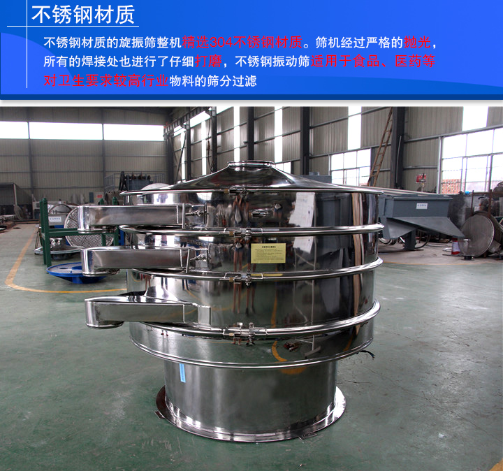不銹鋼材質(zhì)的旋振篩即為不銹鋼振動(dòng)篩,其整機(jī)精選304不銹鋼材質(zhì)。篩機(jī)經(jīng)過(guò)嚴(yán)格的拋光,所有的焊接處也進(jìn)行了仔細(xì)打磨,不銹鋼振動(dòng)篩適用于食品、醫(yī)藥等對(duì)衛(wèi)生要求較高行業(yè)?物料的篩分過(guò)濾。