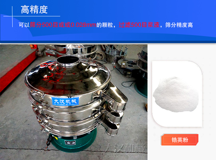 鋯英粉是一種工業(yè)材料,是一種優(yōu)質(zhì)、價(jià)廉的乳濁劑,被廣泛用于各種建筑陶瓷、衛(wèi)生陶瓷、日用陶瓷、一級(jí)工藝品陶瓷等的生產(chǎn)中,在陶瓷釉料的加工生產(chǎn)中,使用范圍廣,應(yīng)用量大。鋯英粉在生產(chǎn)加工環(huán)節(jié)需要使用振動(dòng)篩設(shè)備對(duì)其進(jìn)行篩分,以提高鋯英粉的精度,那么什么設(shè)備可以篩分鋯英粉呢?大漢廠家在這里向您推薦一款高精度細(xì)粉篩分設(shè)備—旋振篩。