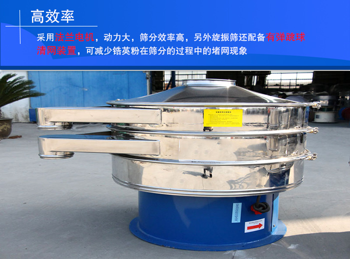 旋振篩采用法蘭電機(jī),動(dòng)力大,篩分效率高,另外旋振篩還配備有彈跳球清網(wǎng)裝置,可減少鋯英粉在篩分的過程中的堵網(wǎng)現(xiàn)象,極大的提高了篩分效率。