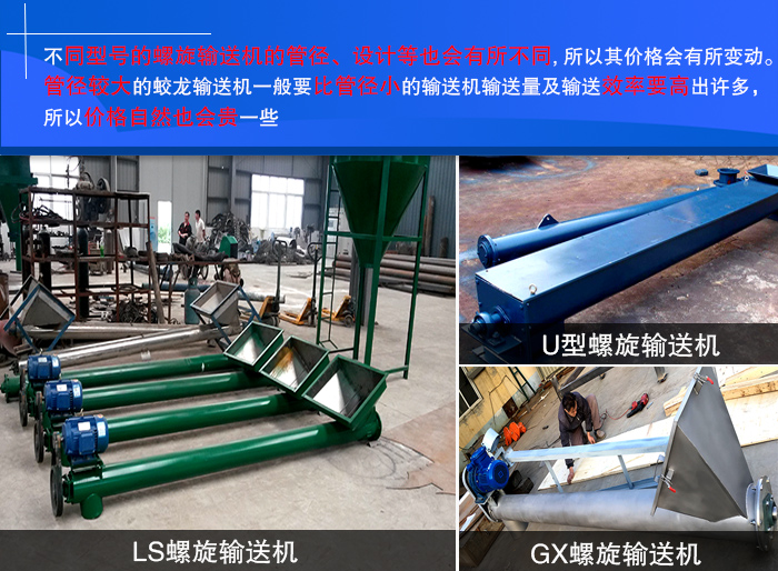 新鄉(xiāng)大漢生產(chǎn)的蛟龍螺旋輸送機主要有LS螺旋輸送機、U型螺旋輸送機、GX螺旋輸送機等,不同型號的螺旋輸送機的管徑、設計等也會有所不同, 所以其價格會有所變動。管徑較大的蛟龍輸送機一般要比管徑小的輸送機輸送量及輸送效率要高出許多,所以價格自然也會貴一些。