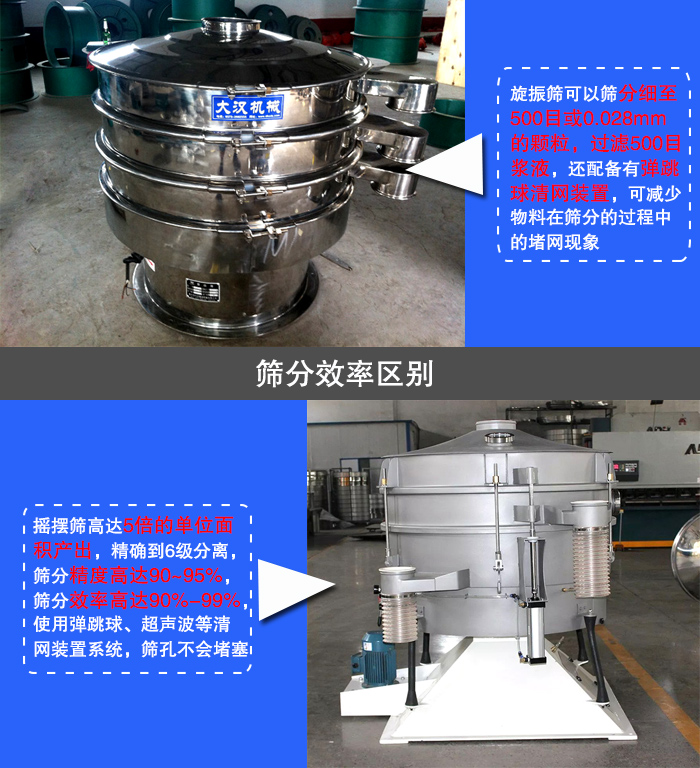 旋振篩可以篩分細(xì)至500目或或0.028mm的顆粒,過(guò)濾500目漿液,還配備有彈跳球清網(wǎng)裝置,可減少物料在篩分的過(guò)程中的堵網(wǎng)現(xiàn)象,極大的提高了篩機(jī)的篩分產(chǎn)量和篩分效率。