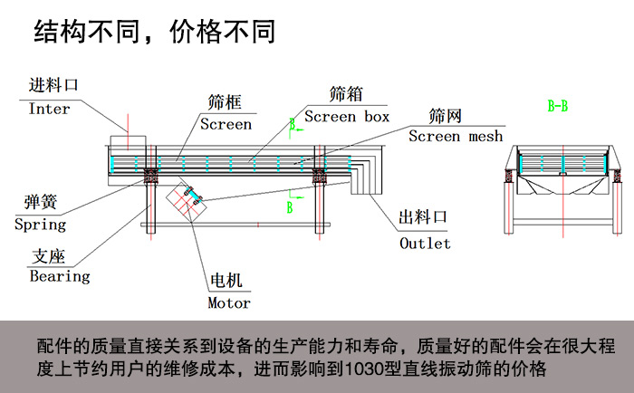 1030型直線振動(dòng)篩配件主要振動(dòng)電機(jī)、減震彈簧、篩網(wǎng)、清網(wǎng)裝置等,配件的質(zhì)量直接關(guān)系到設(shè)備的生產(chǎn)能力和壽命,質(zhì)量好的配件會(huì)在很大程度上節(jié)約用戶的維修成本,進(jìn)而影響到1030型直線振動(dòng)篩的價(jià)格。
