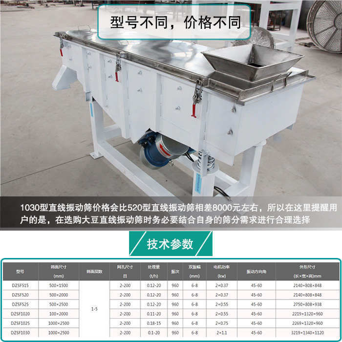 大豆直線振動(dòng)篩型號(hào)不同,其價(jià)格也是不同的。不同用戶對(duì)有大豆篩分產(chǎn)量與精度的要求不同,所以選擇的直線振動(dòng)篩型號(hào)也自然是不同的,所以針對(duì)不同型號(hào)的直線振動(dòng)篩,其價(jià)格會(huì)存在差異。1030型直線振動(dòng)篩價(jià)格會(huì)比520型直線振動(dòng)篩相差8000元左右,所以在這里提醒用戶的是,在選購(gòu)大豆直線振動(dòng)篩時(shí)務(wù)必要結(jié)合自身的篩分需求進(jìn)行合理選擇。