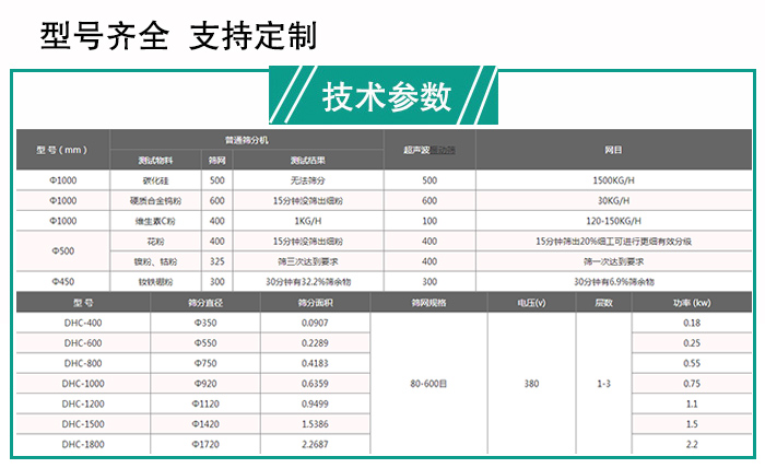 大漢不銹鋼超聲波振動篩型號有DHC-400、DHC-600、DHC-800、DHC-1000、DHC-1200、DHC-1500、DHC-1800等,所有型號都有生產(chǎn),且都是現(xiàn)貨供應(yīng),如果我們的設(shè)備還不能讓您滿意,大漢廠家還可為您免費特殊定制。