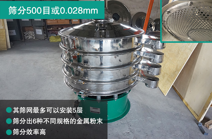 大漢金屬粉末振動(dòng)篩可以篩分500目或0.028mm粉塵及顆粒狀物料,篩分精準(zhǔn),其篩網(wǎng)可以安裝5層,篩分出6種不同規(guī)格的,功能十分強(qiáng)大,篩分效率高。