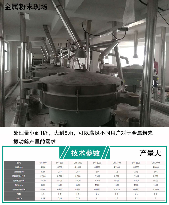 新鄉(xiāng)大漢金屬粉末振動(dòng)處理量小到1t/h,大到5t/h,可以滿足不同用戶對(duì)于金屬粉末振動(dòng)篩產(chǎn)量的需求。