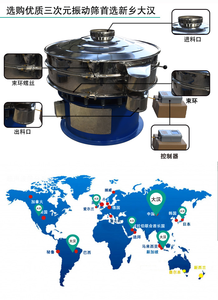 新鄉(xiāng)大漢三次元振動篩可以篩分細至500目或或0.028mm的顆粒,過濾500目漿液,1~5層設(shè)計,可以滿足不同用戶的篩分需求,可以保證用戶的生產(chǎn)效益。