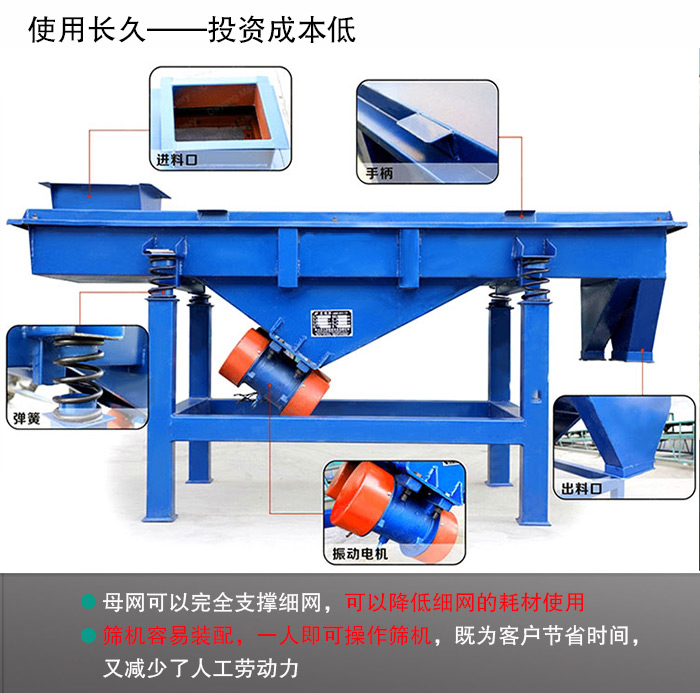 直線振動篩采用獨特的篩網(wǎng)結構設計,其母網(wǎng)可以完全支撐細網(wǎng),因此細網(wǎng)使用壽命長,從而可以降低細網(wǎng)的耗材使用,而且篩網(wǎng)更換方便和快速,只需3-5分鐘,并且篩機容易裝配,一人即可操作篩機,既為客戶節(jié)省時間,又減少了人工勞動力,減少用戶的投資成本。