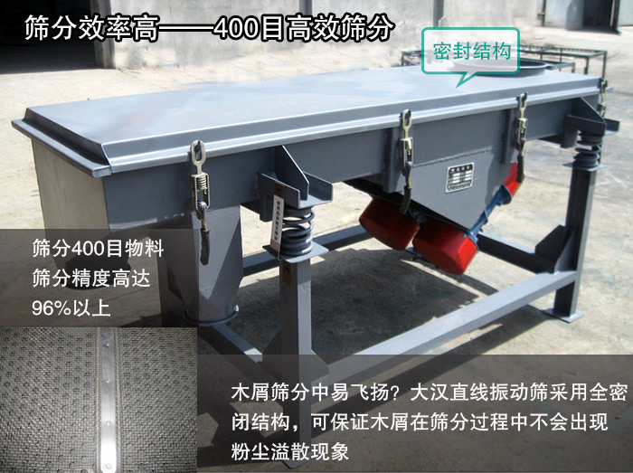 直線振動篩可以篩分400目物料,篩分精度高達96%以上,采用全密閉結構,可保證木屑在篩分過程中不會出現(xiàn)粉塵溢散現(xiàn)象,可以進一步提高直線振動篩篩分效率。