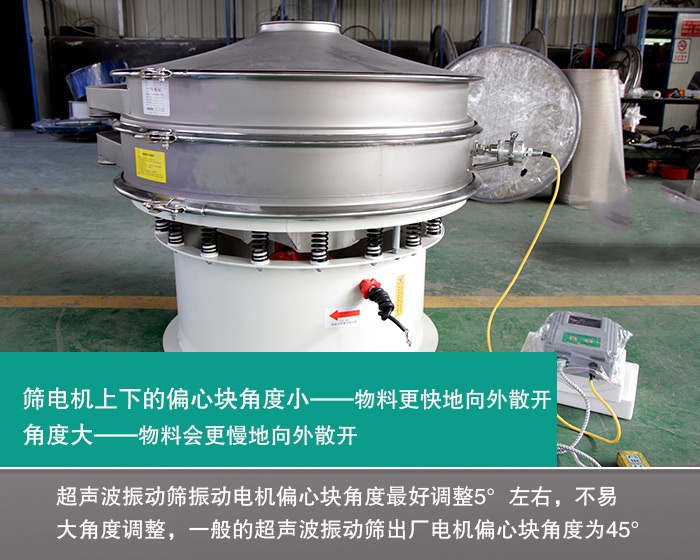 改善出料慢還可以通過調(diào)整超聲波振動(dòng)篩電機(jī)上下偏心塊角度實(shí)現(xiàn)。如果超聲波振動(dòng)篩電機(jī)上下的偏心塊角度小,會(huì)使篩面上的物料更快地向外散開,角度變大的話,則物料會(huì)更慢地向外散開。