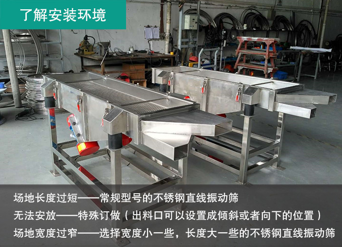 如果遇到場地長度短,選擇常規(guī)型號的不銹鋼直線振動篩篩是無法安放的,這時就需要特殊訂做了,比如出料口可以設置成傾斜或者向下的位置,具體可以可以根據(jù)您的需求而定。當場地寬度過窄,不銹鋼直線振動篩就可以選擇寬度小一些,長度大一些的直線篩設備。