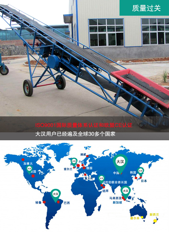 新鄉(xiāng)大漢擁有先進(jìn)生產(chǎn)技術(shù)及焊接工藝,專(zhuān)業(yè)化技術(shù)團(tuán)隊(duì)經(jīng)過(guò)多次對(duì)移動(dòng)式皮帶輸送機(jī)進(jìn)行研究改進(jìn),以完善的檢測(cè)手段和嚴(yán)格的質(zhì)量管理體系打造出品質(zhì)優(yōu)良的設(shè)備,贏得了良好的企業(yè)信譽(yù),大漢移動(dòng)式皮帶輸送機(jī)質(zhì)量通過(guò)ISO9001國(guó)際質(zhì)量體系認(rèn)證和歐盟CE認(rèn)證,大漢用戶已經(jīng)遍及全球30多個(gè)國(guó)家,這是值得您信任的合作商。