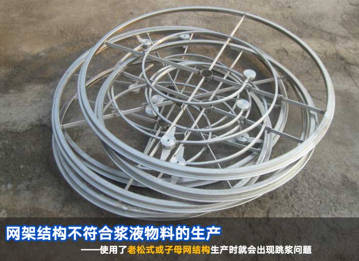 漿液類物料的篩分設(shè)備多為圓形振動篩。該形式的設(shè)備所用網(wǎng)架結(jié)構(gòu)可分為老松式網(wǎng)架、子母網(wǎng)架、膠粘網(wǎng)架。如在漿液生產(chǎn)過程中網(wǎng)架結(jié)構(gòu)使用了老松式或子母網(wǎng)結(jié)構(gòu)生產(chǎn)時就會出現(xiàn)跳漿問題了。這是由于老松式和子母網(wǎng)的網(wǎng)架結(jié)構(gòu)在篩分漿液類物料時由于清網(wǎng)裝置打擊力度較大所以漿液物料進(jìn)入篩面后會由于激振力過強(qiáng)使?jié){液跳起出現(xiàn)跳漿問題。