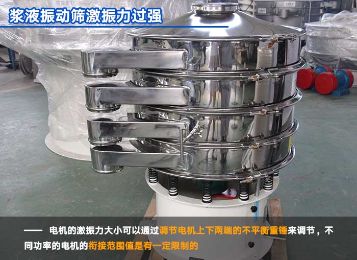激振力過強(qiáng)也會導(dǎo)致漿液振動篩出現(xiàn)跳漿情況,振動電機(jī)的激振力過強(qiáng),漿液進(jìn)入篩面上因受到的激振力過大,就會出現(xiàn)物料上跳的現(xiàn)象,電機(jī)的激振力大小可以通過調(diào)節(jié)電機(jī)上下兩端的不平衡重錘來調(diào)節(jié)。有些客戶為可增加漿液的篩分產(chǎn)量,在使用的過程中會調(diào)節(jié)電機(jī)的激振力而造成激振力過大,漿液跳漿的現(xiàn)象。