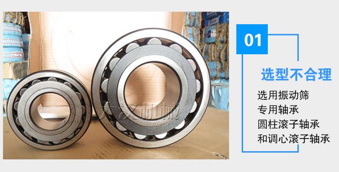 解決方法:選用振動篩專用軸承,常用的振動篩軸承一般有圓柱滾子軸承和調(diào)心滾子軸承,圓柱滾子軸承可以承受較高的極限轉(zhuǎn)速,對動靜載荷的承載能力強,但對軸承座孔的同軸度要求較高,調(diào)心滾子軸承調(diào)心性能好,能補償因軸承座孔加工造成的不同軸問題,但不能承受純軸向載荷。