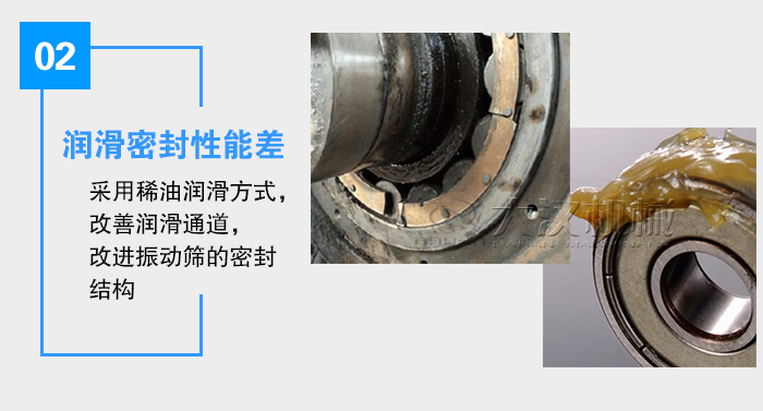解決方法:采用稀油潤滑方式,改善潤滑通道,改進振動篩的密封結(jié)構(gòu),當前不少振動篩廠家采用稀油循環(huán)潤滑,迷宮密封與其他非接觸性密封結(jié)合的結(jié)構(gòu)。