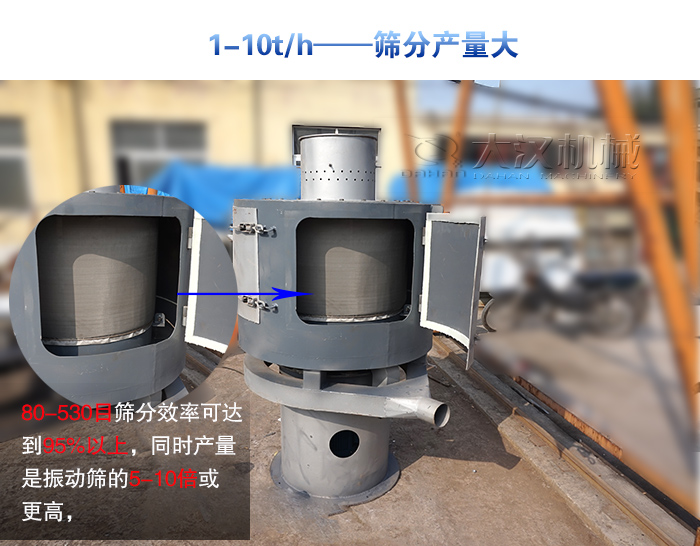 粉末篩分易引起粉塵飛揚(yáng),更難達(dá)到技術(shù)要求,立式氣流篩適合80-530目有網(wǎng)各種粉狀物料篩選分級(jí),篩分效率可達(dá)到95%以上,同時(shí)產(chǎn)量是振動(dòng)篩的5-10倍或更高,還可以可與各種磨機(jī),風(fēng)路并網(wǎng)配套使用。
