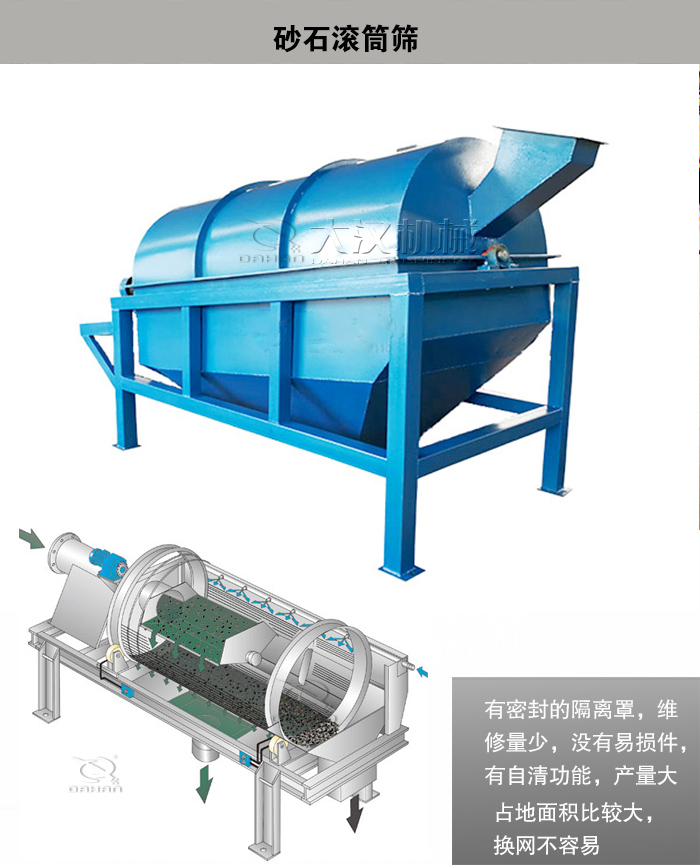 優(yōu)勢(shì):滾筒篩外部設(shè)置有密封的隔離罩,可以降低砂石在篩分過(guò)程中的塵土對(duì)環(huán)境造成的影響,另外,滾筒篩內(nèi)部還有梳型清潔裝置,可以有效解決篩網(wǎng)堵塞的情況,其產(chǎn)量也比較大,每小時(shí)產(chǎn)量范圍在50-800噸/時(shí)。