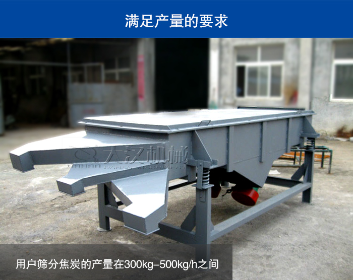 用戶篩分焦炭的產(chǎn)量在300kg-500kg/h之間,1020型直線振動(dòng)篩產(chǎn)量可以達(dá)到300kg/h,大漢1030型雙層直線振動(dòng)篩產(chǎn)量可以達(dá)到500kg/h,在現(xiàn)場使用過程中,完全可以滿足生產(chǎn)線上的需求。
