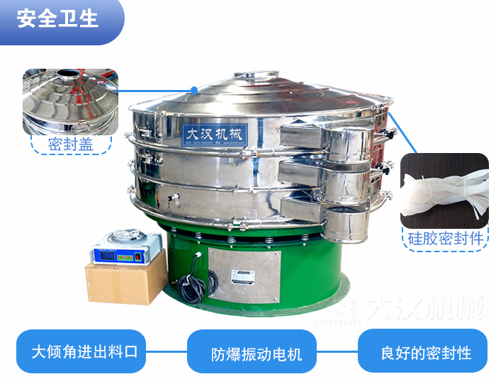 為了保證原材料的衛(wèi)生情況,維生素粉超聲波振動(dòng)篩要具有良好的密封性,密封件全部采用食品硅膠,網(wǎng)架采用潔凈型粘接網(wǎng)架。減震彈簧部分由不銹鋼圍裙包裹;振動(dòng)電機(jī)可定制為更為安全的防爆振動(dòng)電機(jī),確保生產(chǎn)安全。考慮到消毒清洗的性和簡(jiǎn)便性,超聲波振動(dòng)篩的出料口、進(jìn)料口設(shè)計(jì)需要采用大傾角設(shè)計(jì),更利于清洗和消毒。