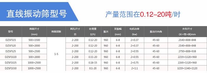 直線(xiàn)振動(dòng)篩DZSF515、DZSF520、DZSF525、DZSF1020、DZSF1025、DZSF1030,產(chǎn)量范圍在0.12-20噸/時(shí),直線(xiàn)振動(dòng)篩的型號(hào)主要是根據(jù)用戶(hù)的篩分產(chǎn)量來(lái)決定的,產(chǎn)量越高的直線(xiàn)振動(dòng)篩,其價(jià)格就會(huì)越高。