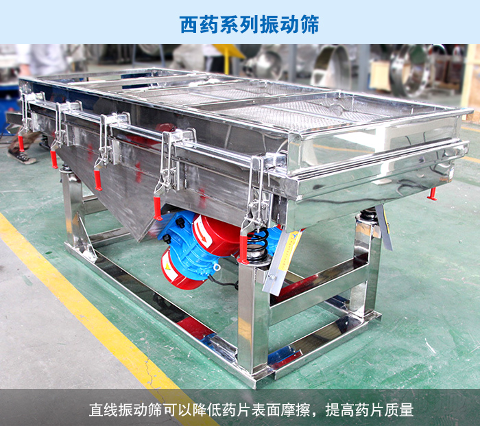 由于西藥多為片狀,外表呈光澤的硬殼狀,所以在篩分過(guò)程中不能使用圓形系列振動(dòng)篩。這是因?yàn)閳A形振動(dòng)篩篩分時(shí)物料在篩網(wǎng)停留時(shí)間長(zhǎng),這樣就會(huì)對(duì)藥片表面產(chǎn)生摩擦從而影響外觀。由于這種原因,我們建議使用直線振動(dòng)篩,對(duì)直線篩進(jìn)行特殊改裝,目的就是讓藥片盡可能的少接觸外面,降低藥片表面摩擦,提高藥片質(zhì)量。
