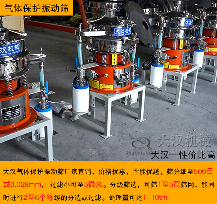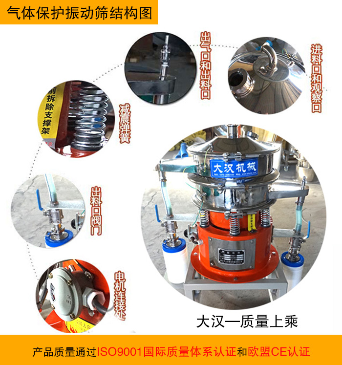 大漢氣體保護振動篩采用304不銹鋼材質(zhì)、氣體保護軟管、防靜電裝置等制作而成,是振動篩和超聲波振動篩的一種衍生產(chǎn)品。產(chǎn)品質(zhì)量通過ISO9001國際質(zhì)量體系認證和歐盟CE認證。