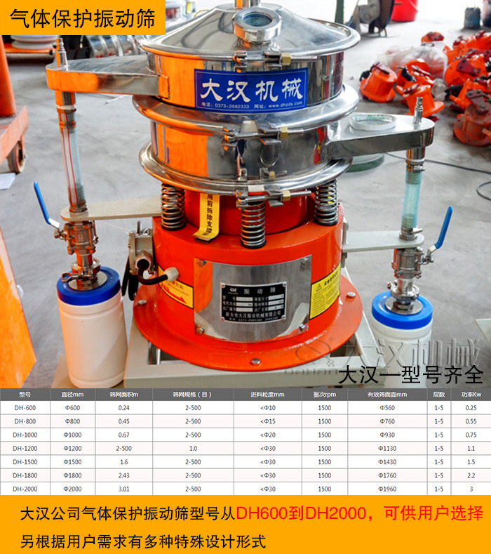 大漢公司氣體保護振動篩型號從DH600到DH2000,可供用戶選擇。氣體保護旋振篩型號是從φ600-φ2000mm直徑,氣體保護旋振篩價格根據(jù)材質(zhì)和直徑大小、層數(shù)價格不同。除擁有DH系列的氣體保護振動篩同等規(guī)格外,另有多種特殊設(shè)計形式,特殊物料的篩分,DH系列的氣體保護振動篩有不同的特殊設(shè)計,尤其是智能振動超聲控制器的針對性設(shè)計、懶性氣體保護下篩分的設(shè)備結(jié)構(gòu)等。各種型號的設(shè)備都有現(xiàn)貨且可為用戶提供定制生產(chǎn),能夠大限度地滿足用戶的需求。