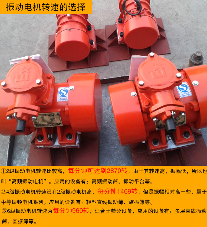 6級(jí)振動(dòng)電機(jī)轉(zhuǎn)速為每分鐘960轉(zhuǎn),適合于篩分設(shè)備,應(yīng)用的設(shè)備有:多層直線振動(dòng)篩、圓振篩等。