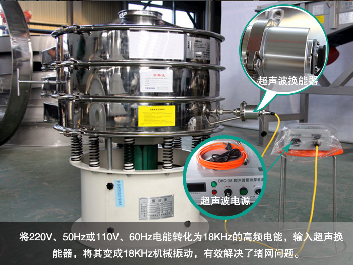 石墨粉比重較輕,粒度細(xì)在90到20微米以下,易抱團(tuán),流動(dòng)性較好。普通振動(dòng)篩在篩分過(guò)程中會(huì)出現(xiàn)物料團(tuán)聚,漏料的情況,從而造成嚴(yán)重的堵網(wǎng)現(xiàn)象,而超聲波振動(dòng)篩是將220V、50Hz或110V、60Hz電能轉(zhuǎn)化為18KHz的高頻電能,輸入超聲換能器,將其變成18KHz機(jī)械振動(dòng),使篩面上的石墨粉始終保持懸浮狀態(tài),有效解決了堵網(wǎng)問(wèn)題。