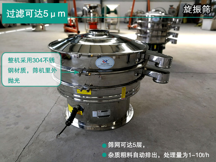 旋振篩整機(jī)采用304不銹鋼材質(zhì),篩機(jī)里外拋光,干凈衛(wèi)生,更適合醫(yī)藥、食品等對衛(wèi)生條件有高要求的行業(yè)使用,可篩至500目,過濾可達(dá)5μm,采用"強(qiáng)力"新型動力激振器,三維動力更加突出,適用范圍更加廣泛,篩網(wǎng)可達(dá)5層,雜質(zhì)粗料自動排出,可以連續(xù)作業(yè),處理量為1-10t/h。