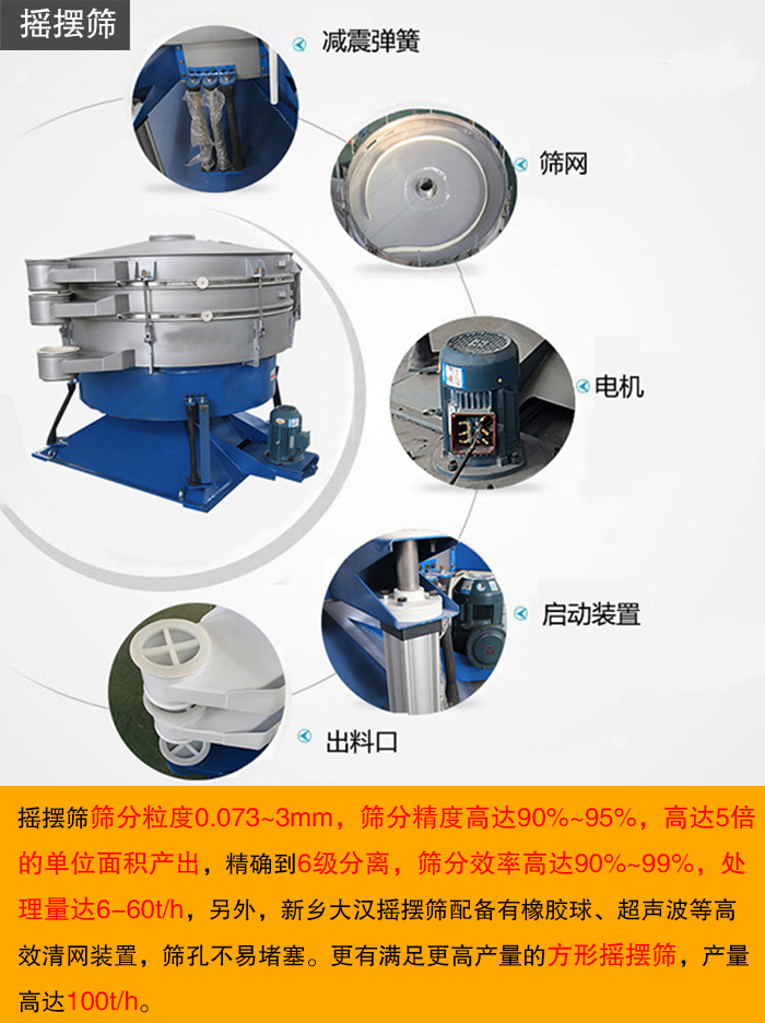 粘性粉狀物料在篩分過程中,由于其具有強的吸附性往往會造成堵網現象,搖擺篩是機械模擬人工篩分的一種高效篩分機,篩分精度、篩分效率、篩網使用壽命是常規(guī)圓篩的5-10倍,符合所有精細與超細范圍的粉末與微粒狀物料,特別適合難以處理的物料。
