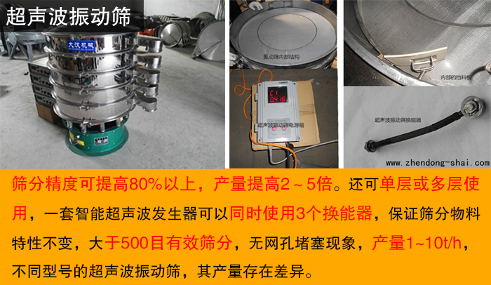 在解決粘性物料堵網問題的情況下,大漢超聲波振動篩而且精度可提高80%以上,產量達到1~10t/h,不同型號的超聲波振動篩,其產量存在差異。