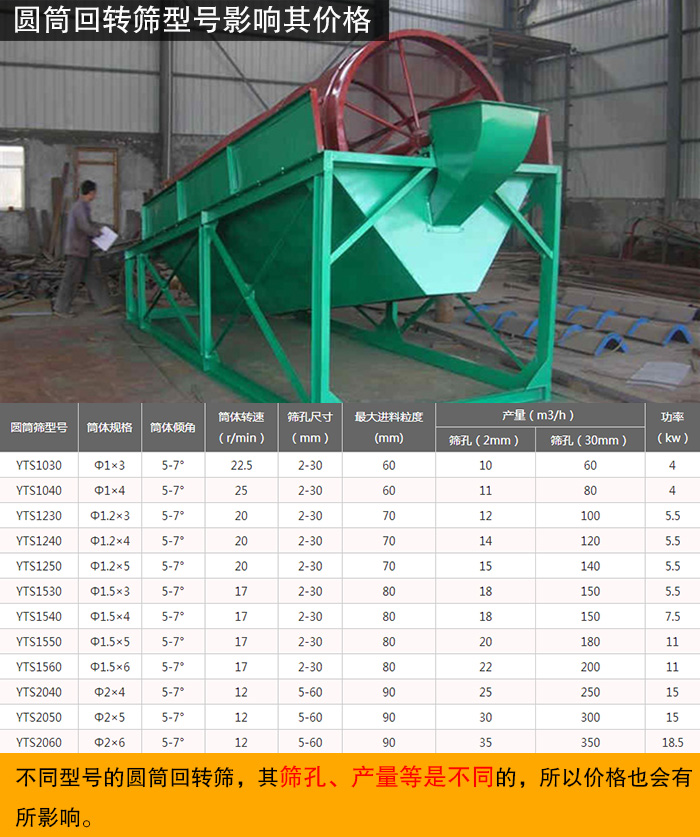 不同型號的圓筒回轉(zhuǎn)篩,其篩孔、產(chǎn)量是不同的,所以價格也會有所影響。圓筒回轉(zhuǎn)篩型號從YTS1030-YTS2060,其產(chǎn)量必然也是隨之增加的。圓筒回轉(zhuǎn)篩設(shè)備型號越大,產(chǎn)量就越高,其價格就會越高。(附參數(shù)表)